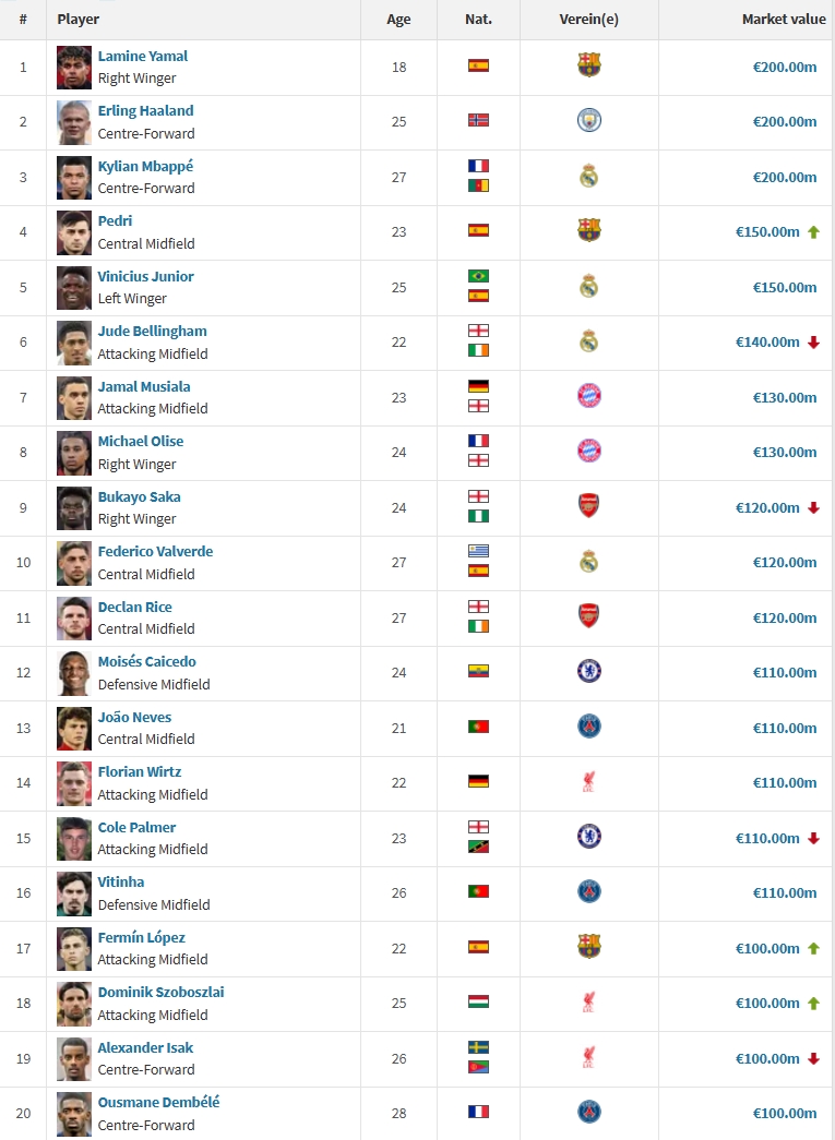 足坛20位亿元先生:费尔明新晋 亚哈姆2亿 英超8人西甲7人意甲0人